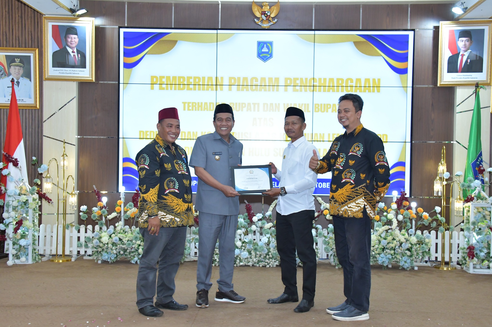 Acara juga dirangkai dengan penyerahan penghargaan kepada Bupati HSS atas dedikasi dan kontribusi atas kemajuan lembaga BPD di Kab HSS yang langsung diserahkan oleh Ketua PABPDSI Kab HSS.